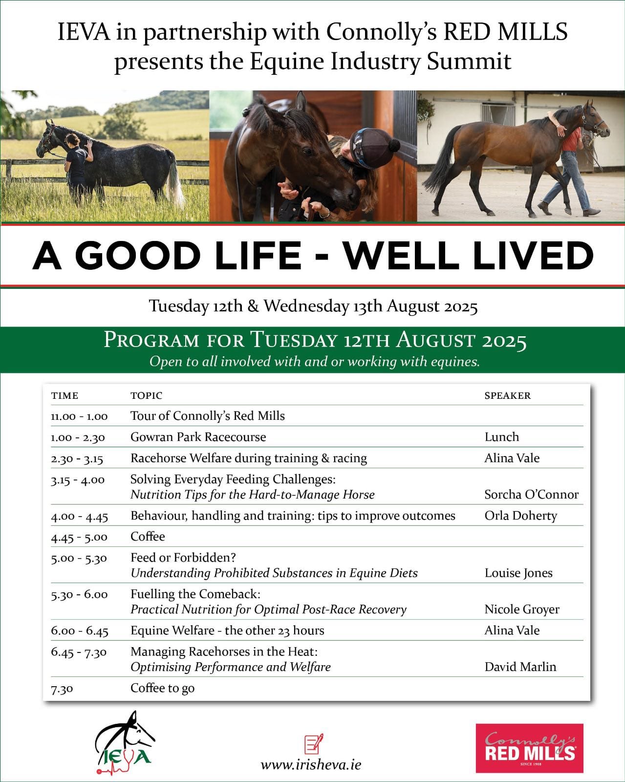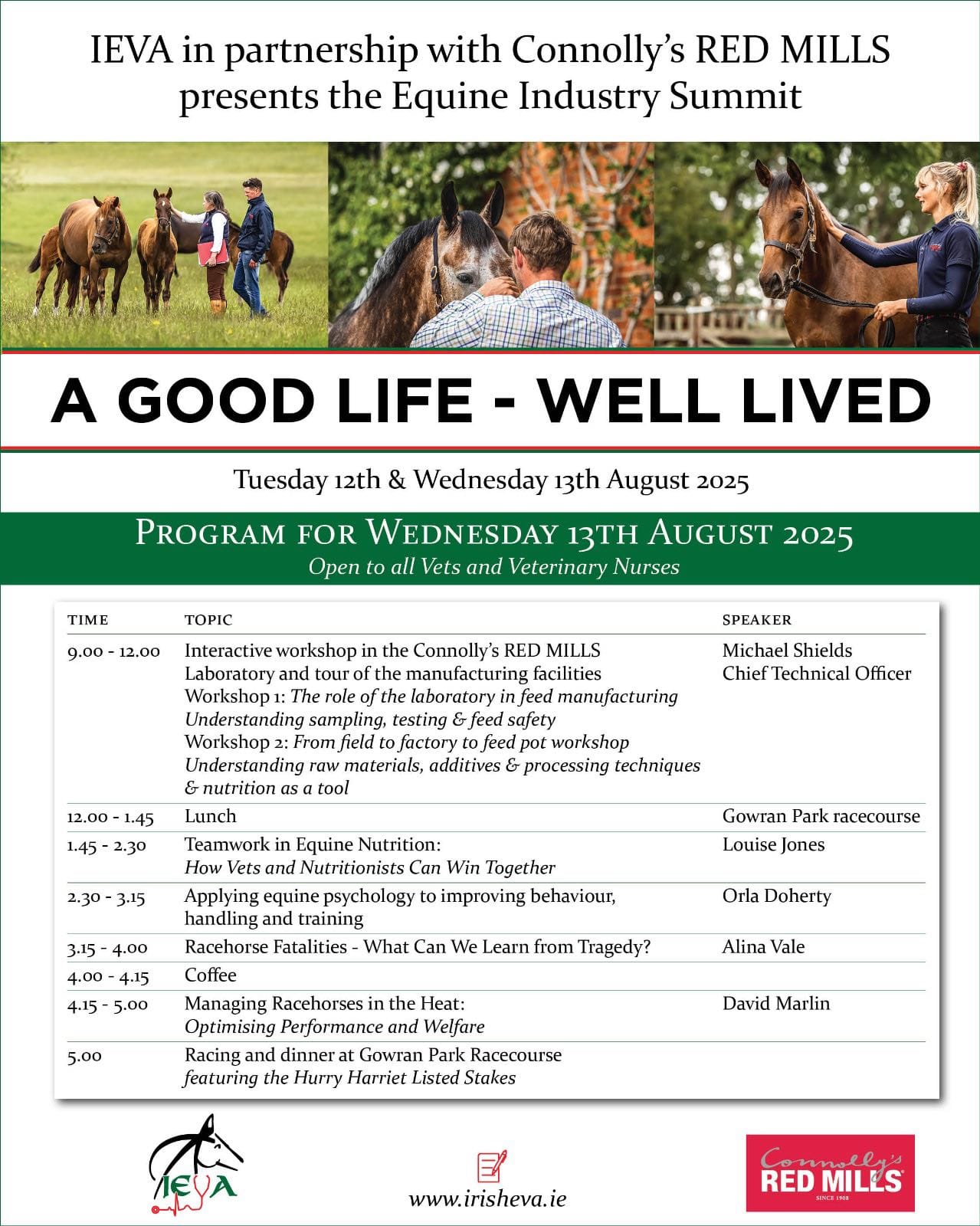 The Irish Equine Veterinary Association (IEVA), in partnership with Connolly’s RED MILLS, is set to host one of the most comprehensive and thought-provoking events in the equine calendar this year – The Equine Industry Summit: A Good Life – Well Lived. Taking place on Tuesday 12th and Wednesday 13th August 2025, the summit promises two days of high-level discussion, practical workshops, and invaluable networking opportunities, all centred on the theme of equine welfare, performance, and the science behind keeping our horses healthy and happy.