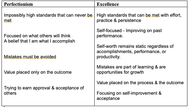 Perfectionism & excellence are distinctly different from one another. Perfectionism tends to be focused on what other people think, whereas excellence or healthy achievement tends to be more internally focusing, improving on our own past performances & doing our best.